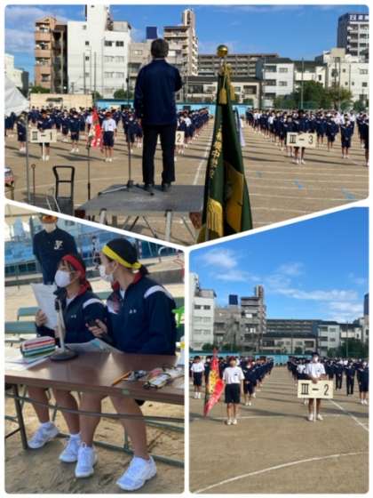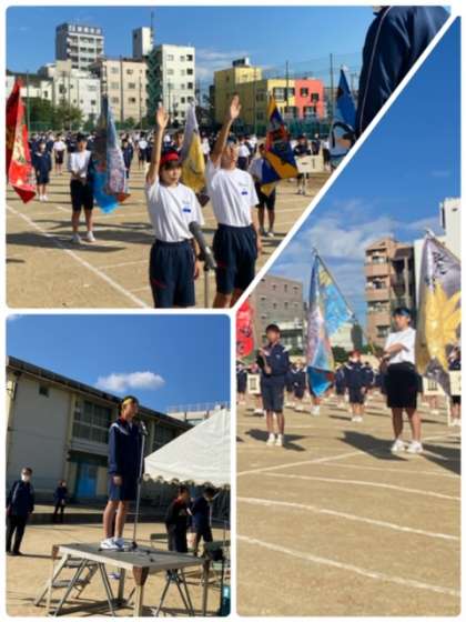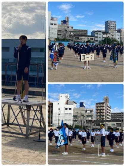 秋晴れのもと、開会式を行いました。生徒たちが主役となり、開会の言葉・選手宣誓・競技上の注意を行っています。