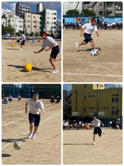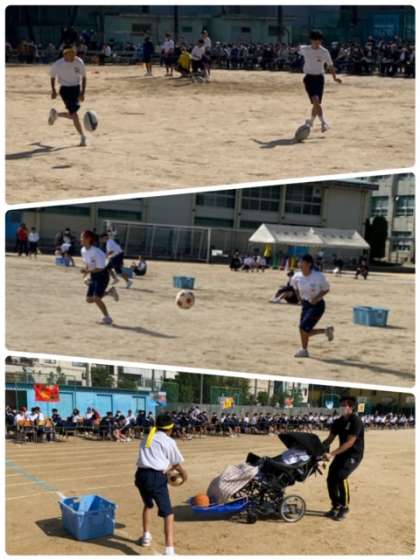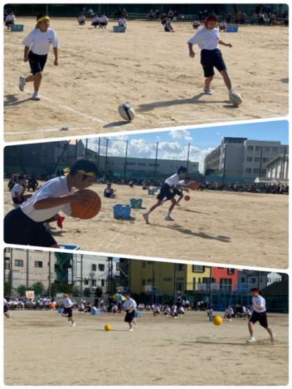 ドリブル走は、バスケットボール・サッカーボールをドリブルして、最後はラグビーボールを蹴っていきます。楕円形のボールはいろんな方向に転がるので、あちこちに行ってしまっています。