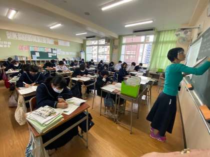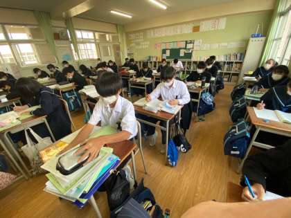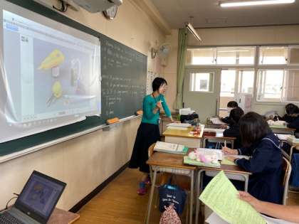 2年生の英語の授業です。黒板に写し出された文房具などを英単語で答えています。身近な生活にあるものを英語で表現できるように学習しています。
