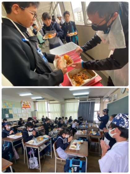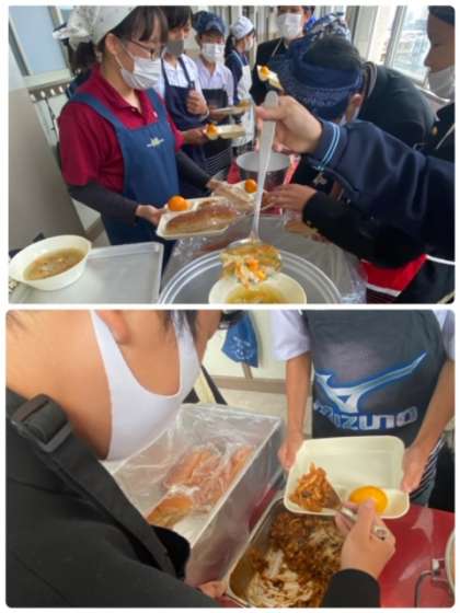 1年生の給食盛り付け、おかわりの様子です。グラタンが人気で多くの生徒たちが、たくさん食べています。今日も美味しくいただきました!