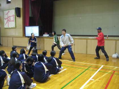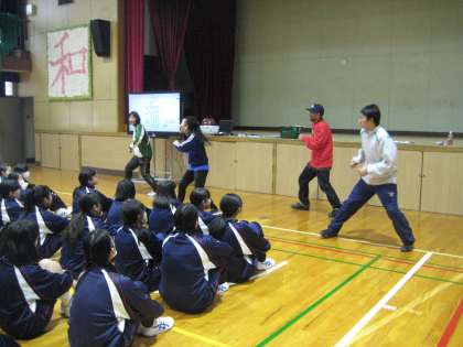 1年生の授業では、インストラクターのTATUYAさん、Chika−Jさん、本校体育科の田代先生、橋山先生の4人が振付の見本を見せるのに、即興でダンスをしました。