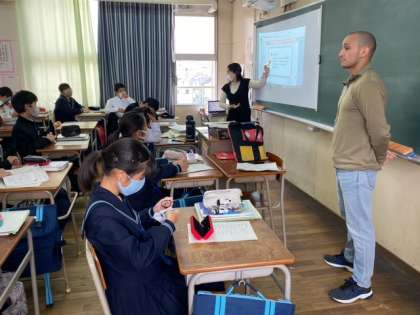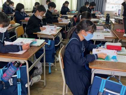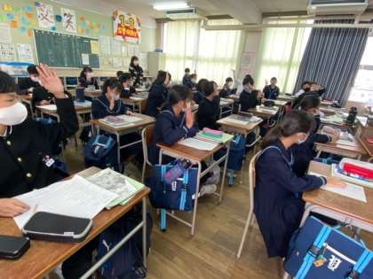 1年生の英語の授業では、C-NETの先生と一緒に学習しています。積極的に手を挙げている様子もあり、英語力を伸ばすよう指導しています。