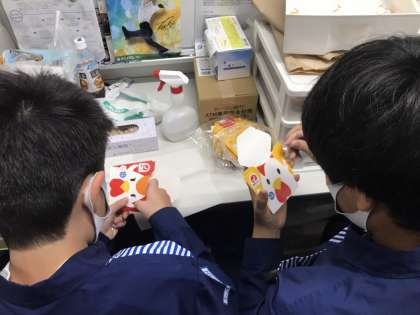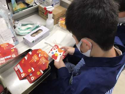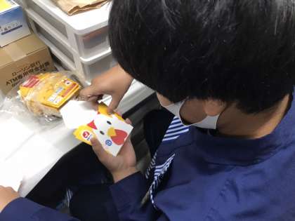 コンビニエンスストアで職場体験を行っています。「からあげクン」の入れ物を組み立てています。いつも購入する立場ですが、裏方のお仕事を体験しています。