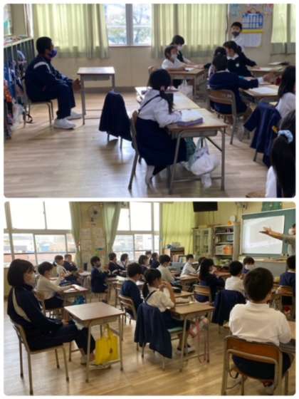 小学校では、昼休みに一緒に遊んだり、掃除を手伝ったり、宿題を作ったりしています。授業では、先生の補助や一緒に盛り上げたりしています。