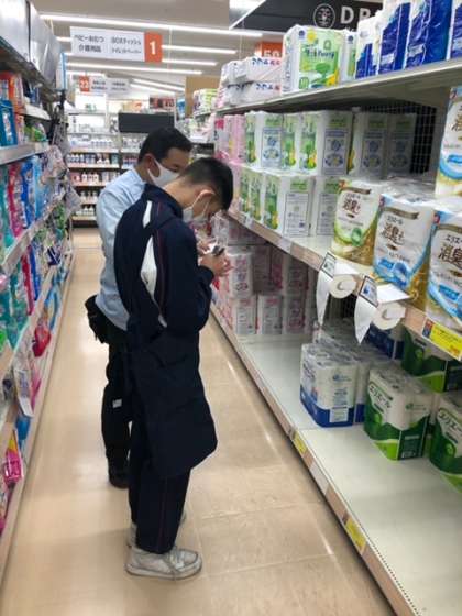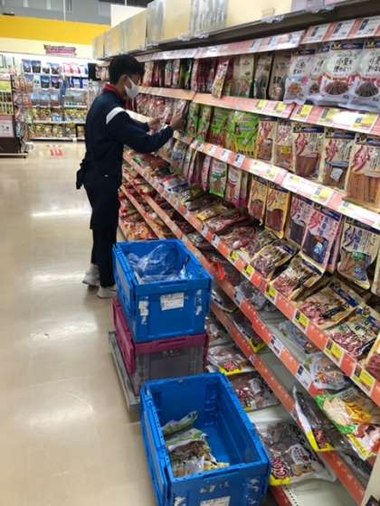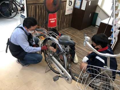 ホームセンターで職場体験を行っています。自転車修理を教えてもらったり、品出しをしたりしています。仕事の大変さを感じていることでしょう。