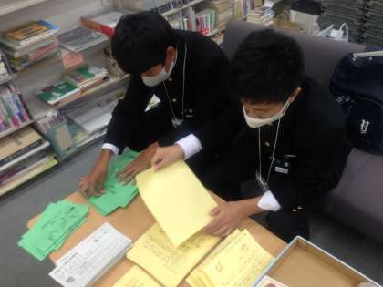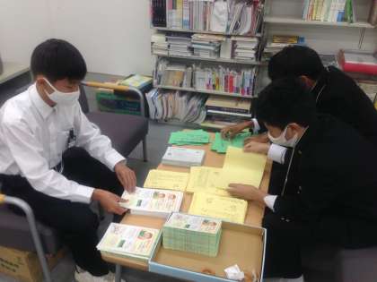 図書館で職場体験を行っています。本の貸出し案内を作っています。利用者ではわからないようなバックヤードを見学しています。