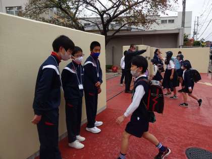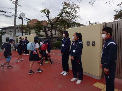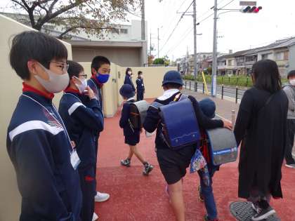 小学校で職場体験している生徒たちは、正門で朝のあいさつ運動を行っています。