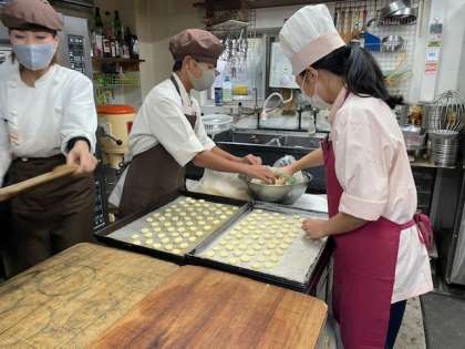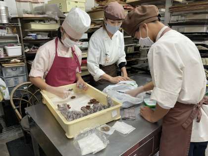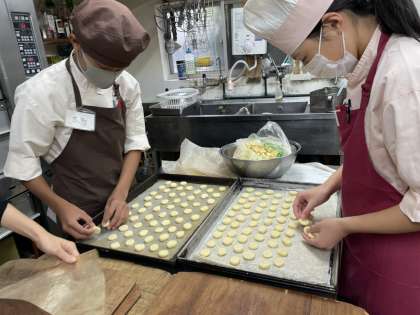 洋菓子屋さんで職場体験を行っています。クッキーづくりをしています。焼きあがったクッキーを袋詰めしてくれ販売してくれました。