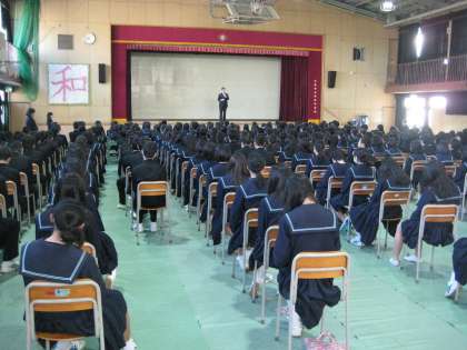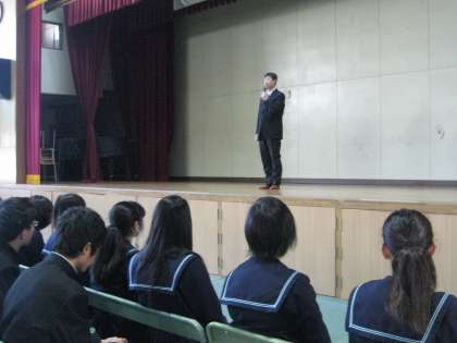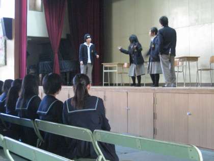 始めに、茨田高校の大森教頭先生からピア・メディエーションの説明を聴き、引き続いて、茨田高校の演劇部の皆さんによるピア・メディエーション劇を見せていただきました。
