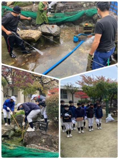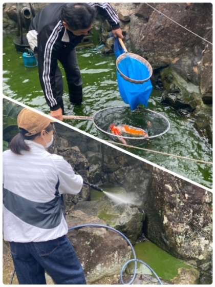 本日、PTA主催の地域美化活動を行いました。あいにくの雨天のため、中庭清掃のみとさせていただきました。本校自慢の中庭池の掃除を行っています。