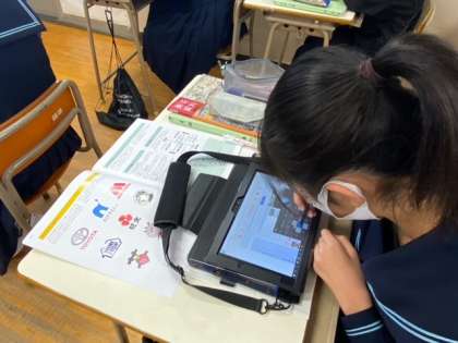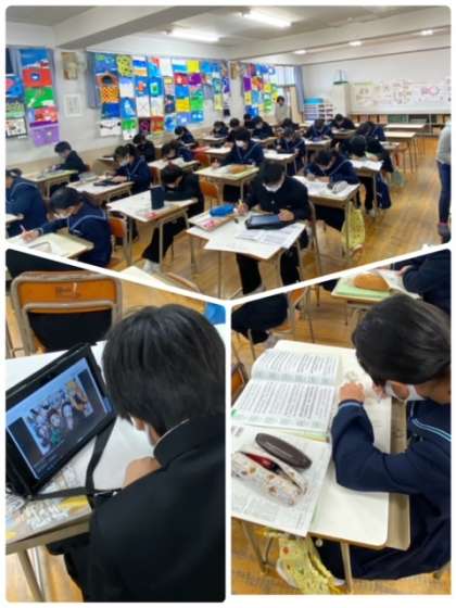 1年生の美術の授業です。ウエルカムボードのデザインを考えています。タブレット端末で検索したり、いろんな字体の本から写したりしています。オリジナリティあふれるデザインが楽しみです。