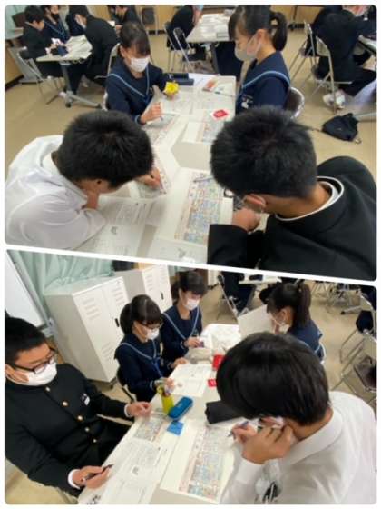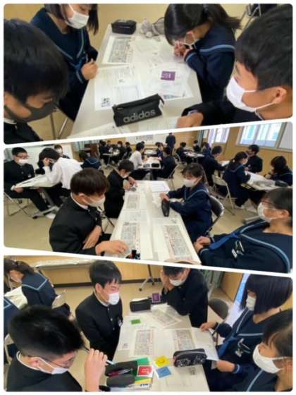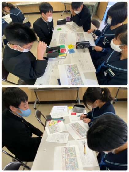 3年生の社会の授業です。「コンビニエンスストアの経営」について、班学習を行っています。長所・短所を自分たちで考えて、どこの場所に出店することが有益なのかをまとめます。