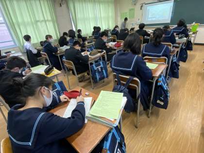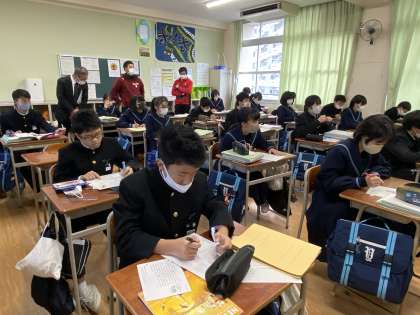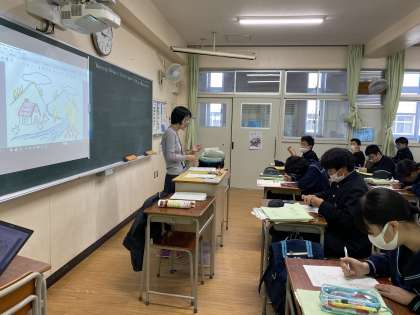 2年生の英語の授業です。本時のねらいは「家や町のまわりにあるものについて、英語で説明することができる」です。日々の授業で培っている能力を発揮しています。