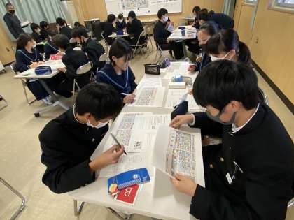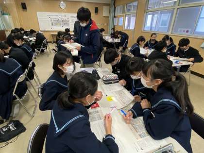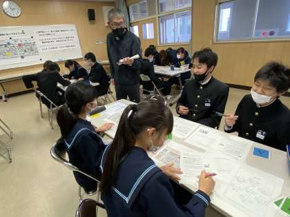 3年生の社会の授業です。本時のねらいは「身近な経済活動に関する課題を通して、『生産・流通・消費を中心とする経済活動』を理解する」です。グループ学習で学びを深めています。
