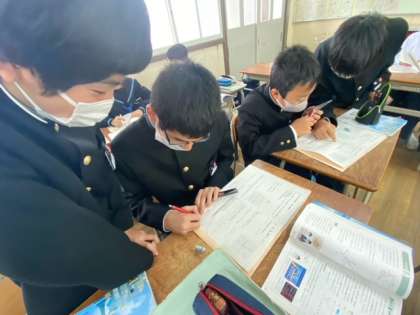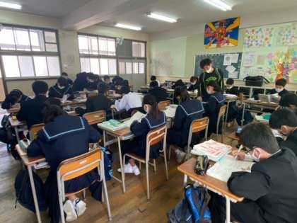 1年生の数学の授業では、コの字型で学習しています。単元や学習内容によって、学習環境を変えることで生徒たちの学びを支援しています。個に応じた学習ができるように工夫しています。