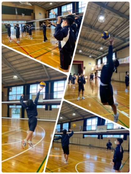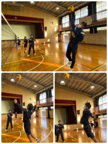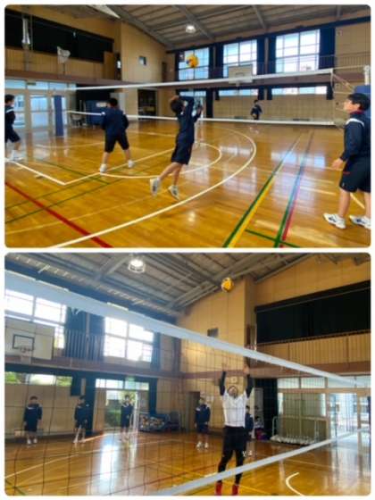 2年生の保健体育の授業では、バレーボールを学習しています。今日からスパイクの練習となるそうで、身体の使い方やボールを打つときのポイント等を聞いています。実際にやってみるとなかなか難しそうですが、一生懸命取り組んでいます。