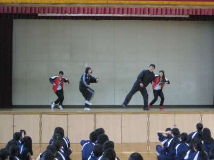 オープニングはインストラクターの「SHAFT BLAZE」AKANEさん・YUKIさんに加え、本校体育科の田代先生・橋山先生の4人チームでダンスを披露しました。