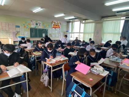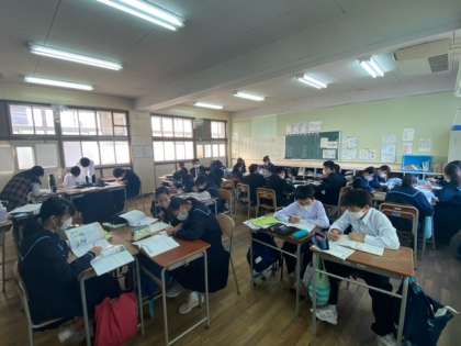 今日から期末テスト1週間前となります。各授業で学習してきた内容を振り返り、習得できているかを確認しています。学級ごとに学習形態がさまざまですが、みんな一生懸命自習ができています。