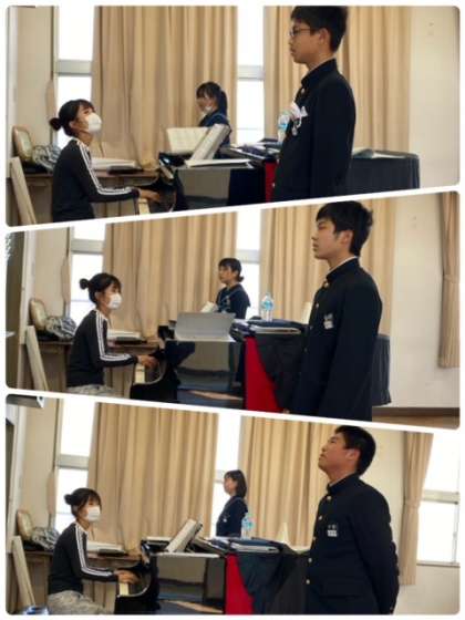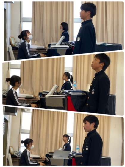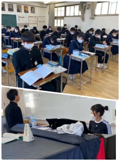 2年生の音楽の授業では、歌唱テストを行っています。「大切なもの」の曲について、男声パート、女声パートに分かれて歌唱しています。伴奏に合わせて、きれいな歌声が聞こえると素敵です。みんな真剣に取り組んでいます。