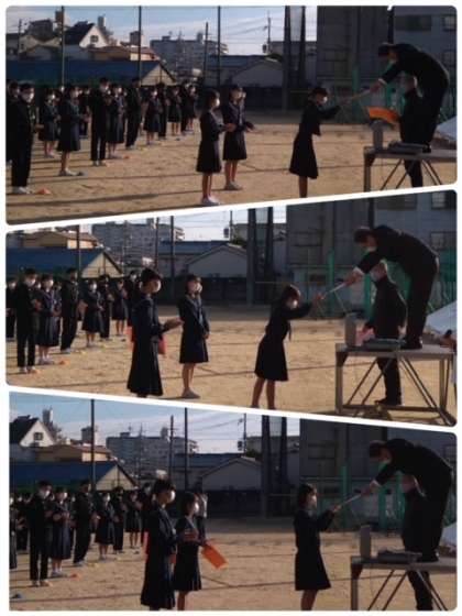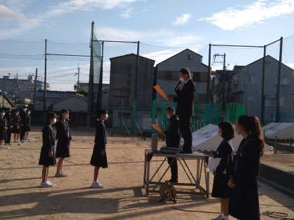 本日、全校集会をグラウンドで行いました。新型コロナウイルス感染症対策を講じたうえで、間隔を広くあけた状態で集合しています。