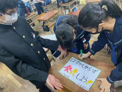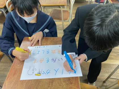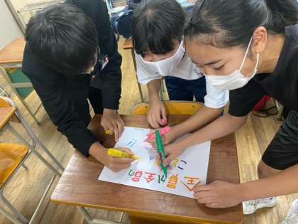 1年生の学級代表・書記では、学級目標を決めてポスター書きしています。学級討議を行い、みんなが楽しい学校生活になるように取り組んでいます。