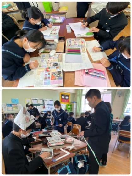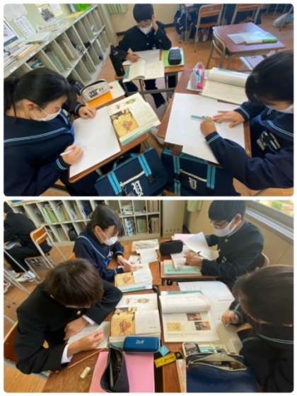 2年生の国語の授業では、平家物語の学習を行っています。班ごとに場面を選択して、発表形式も考えています。紙芝居を作ったり、寸劇を考えたり、さまざまなアイデアがあふれています。