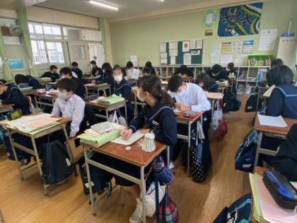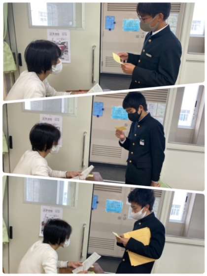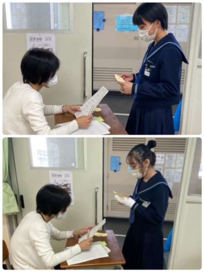 2年生の英語の授業です。C-NETの先生のインタビュー練習を行っています。日頃のスピーキング活動を生かした実践となります。スムーズなやりとりができるように練習しています。