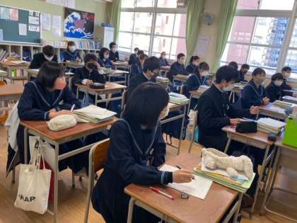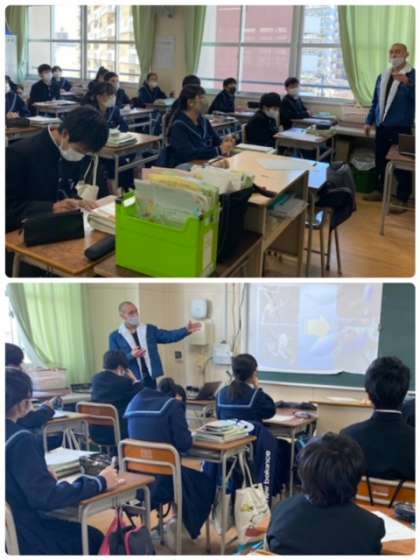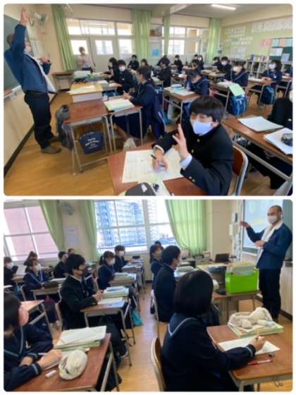 2年生の英語の授業です。C-NETのJohn先生の自己紹介スライドから、聞き取り学習を行っています。家族、ペット、好きなスポーツなど、英語でやり取りができるようにしています。