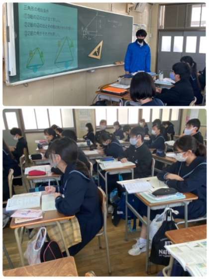 3年生の数学の授業では、図形の単元を学習しています。校舎の高さを求める問題を、図形の合同条件を活用して解いていきます。縮尺の割合を考えるなど、それぞれの方法で答えを導き出しています。