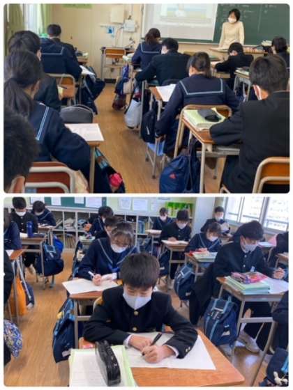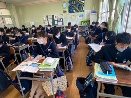 2年生の英語の授業です。外国語の音声や語彙、表現、文法、言語の働きなどを理解するとともに、これらの知識を、聞くこと、読むこと、話すこと、書くことによる実際のコミュニケーションにおいて活用できる技能を身に付けることをねらいとしています。