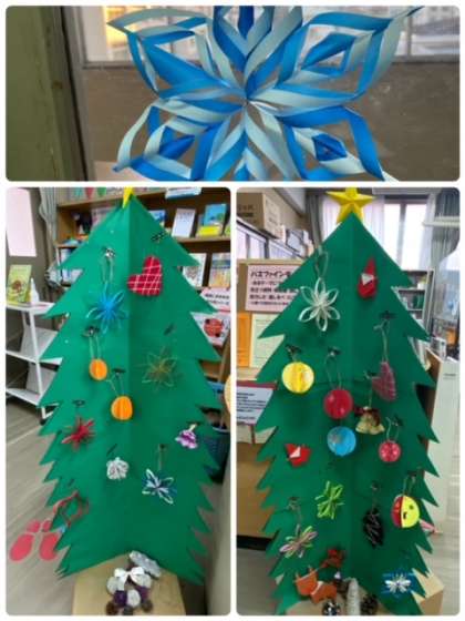懇談中も毎日、図書室を開放しています。学校元気アップ事業として、24日まで手作り教室を開催しています。これまでの作品をクリスマスツリーに飾りました!