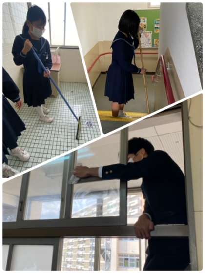 本日は2時間授業を終えて、大清掃を行っています。1年間の感謝の気持ちをこめて、いつもより広い範囲の掃除を丁寧にしています。冬の冷たい水にも関わらず、洗っています。