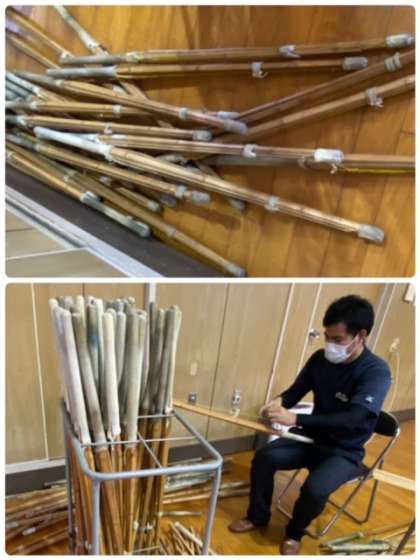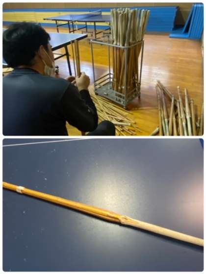 3学期の1・2年生男子保健体育の授業では、武道に取り組みます。今回は剣道を学習しますので、先生がその準備を行っています。元々、本校にあった150本程の竹刀を使える状態にするために、1本1本整備しています。みなさん大切に扱って、しっかり授業を受けましょう。