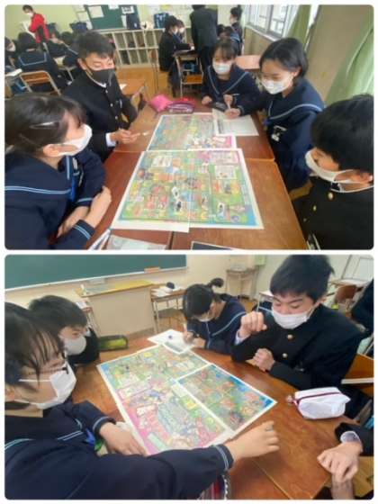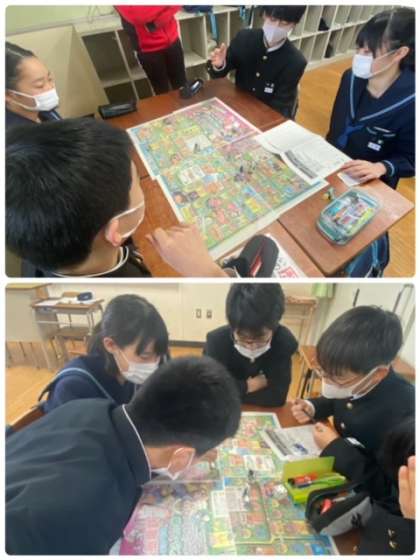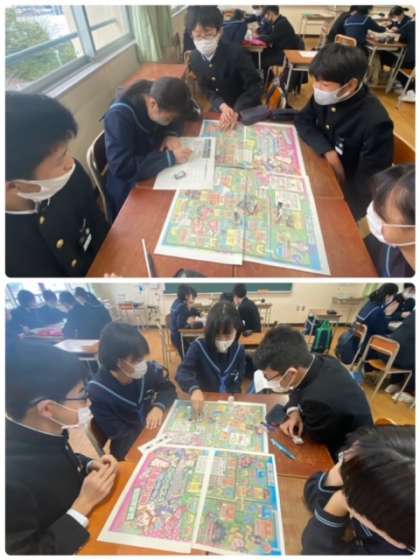 2年生の社会は、今年最初の授業です。新聞に載っていた「桃太郎電鉄すごろく」を活用しています。都道府県の復習にも役立てながら、学習しています。
