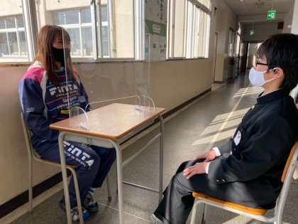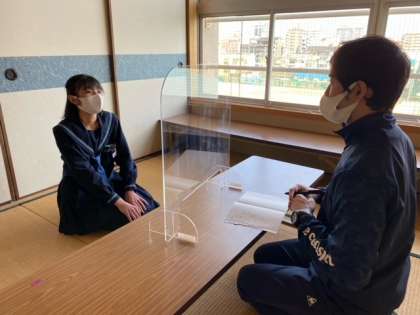 1年生の教育相談の様子です。感染症対策として、アクリル板を活用しています。新型コロナウイルス感染症での不安もあるところですが、元気に学校生活が送られるように頑張っていきましょう!