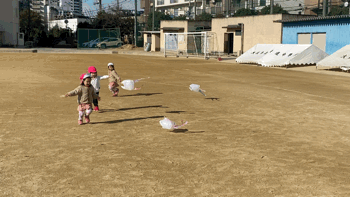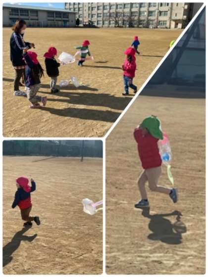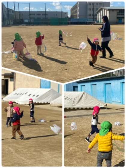本校に隣接するソフィア横堤保育園の園児たちが、グラウンドで凧あげを行っています。
