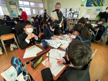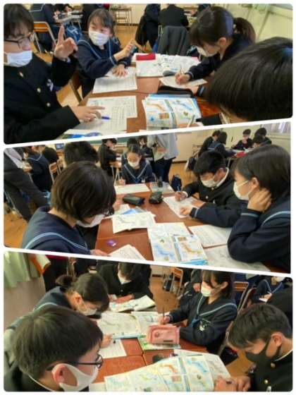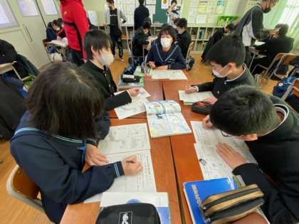 2年生の社会の授業では、地図や資料から情報を読み取り、グループでまとめる学習を行っています。話合いながら、「そうか!こういうことか!」という声も聞こえてきました。一人の考えから班のみんなに共有することで、学びが深まりまっています。