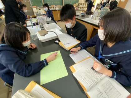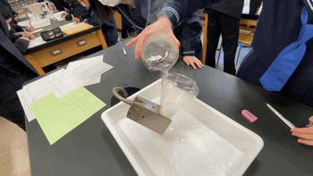 2年生の理科の授業では、空気中の水蒸気の状態変化と温度との関係について学習しています。フラスコの中にゆでたまごを入れたり、出したりすることを考察して、実験しています。ちょうどうまくできたところが見られました!