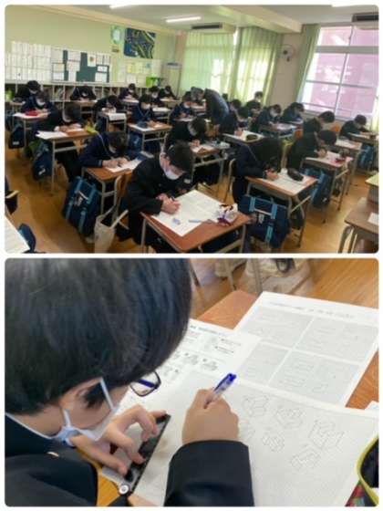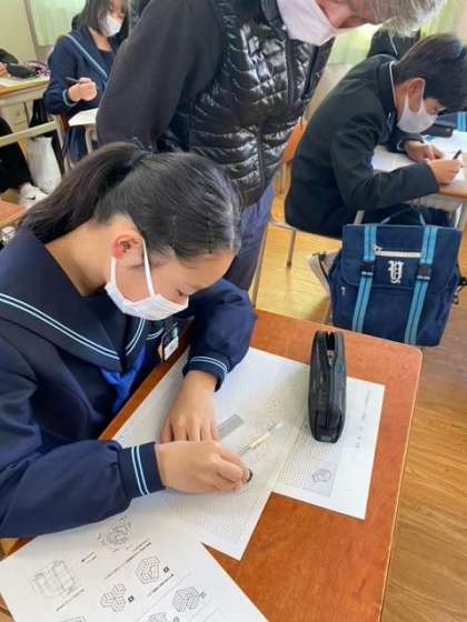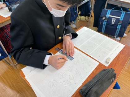 2年生の技術の授業です。マス目の入った用紙に、さまざまな立体の等角図を書いています。立体図形は、数学や美術の教科にも関連づいている内容です。教科横断的な学習で理解を深めましょう。