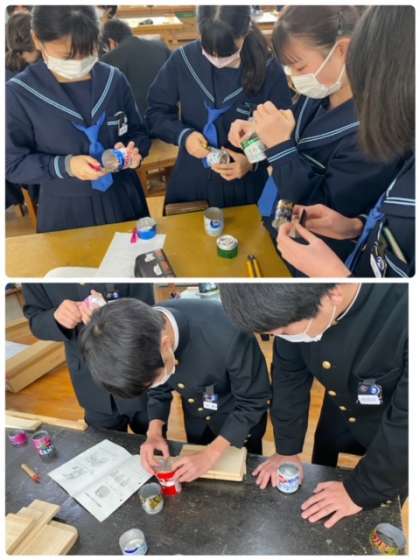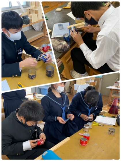 3年生の技術の授業では、空き缶で作るアルコールストーブを製作しています。行程の確認をしたり、作業をお互いに見せ合ったりして進めています。自分の手で実際に作るものには、愛着がわくようです。出来上がりを大切に使いましょう!