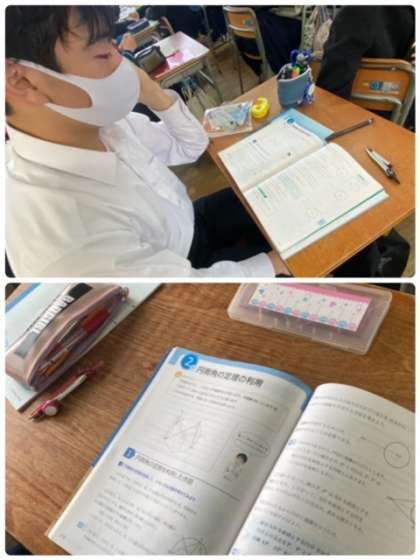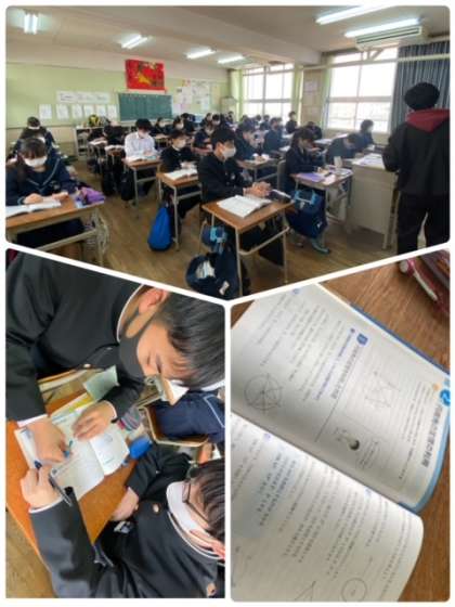 3年生の数学の授業です。私立入試前にして、基本問題に取り組んでいます。数学は、1年生に学習したことを積み重ねて、2・3年生の学習内容になることが多いです。1年生の時に学習した図形について、しっかり復習しておきましょう!