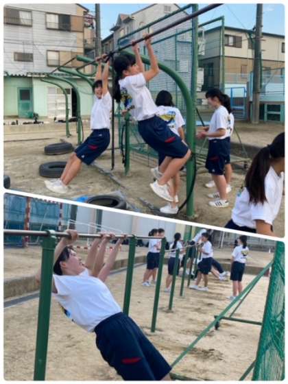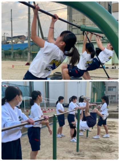 バレーボール部が、鉄棒を活用して筋力トレーニングを行っています。どんな競技でも、基礎体力をつけることが大切です。自分に厳しく、粘り強く取り組む姿勢も養います。