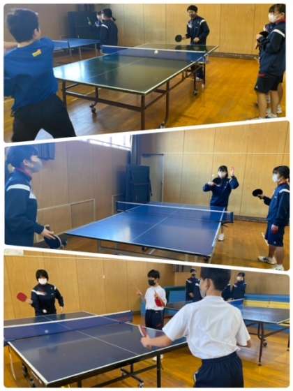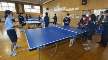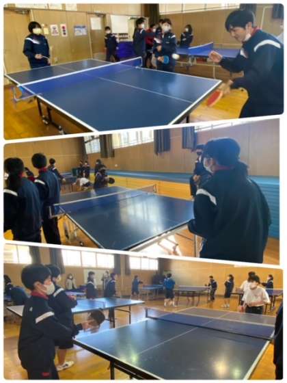 1年生の5限目は、クラスレクレーションを行っています。クラスのみんなで卓球をして楽しんでいます。真剣さの中に親睦が混ざり合った卓球です。学年最後の取組みで交流を深めています。