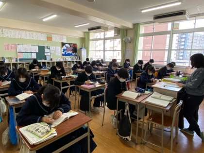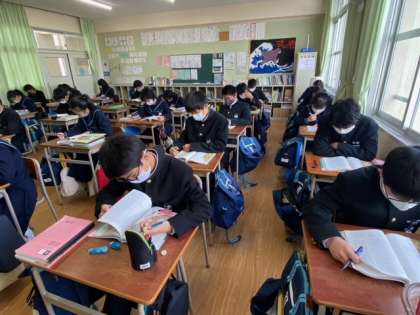 2年生の国語の授業では、小説「走れメロス」を学習しています。今日は、教科書本文を朗読しています。物語に引き込まれながら、集中して読み続けている様子が見られます。