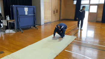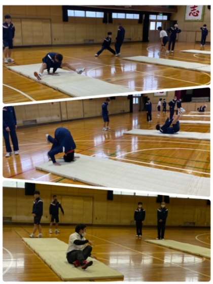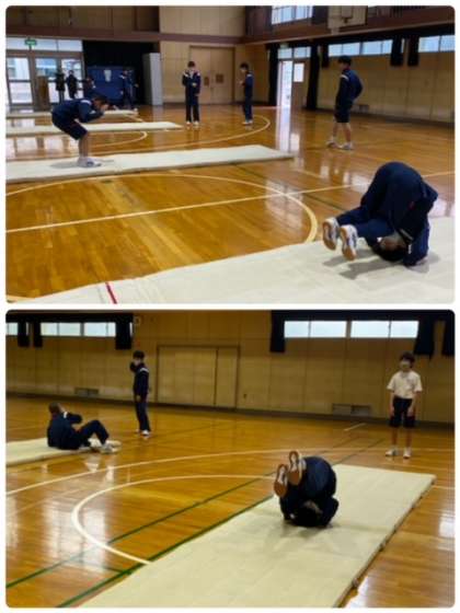 2年生の男子体育の授業は、マット運動を行っています。体育分野の目標として、適切な運動を行うことによって、体力を高め、心身の調和的発達を図るとあります。家で過ごす時間が多い生活様式ですが、日々のストレッチなどで心と身体をほぐしましょう。