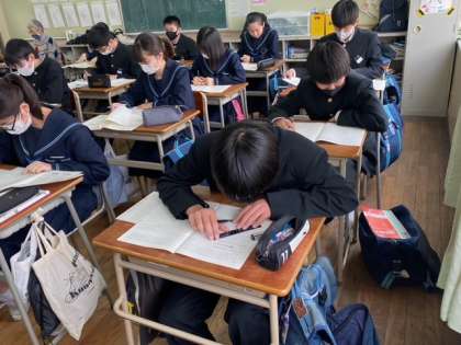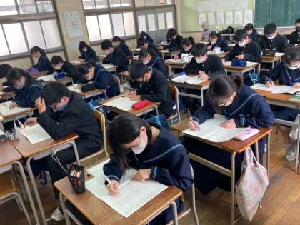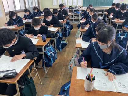 3年生は、黙々と自主学習に取り組んでいます。私学の入試問題は、学校によって特徴があります。受験する高校の赤本を解いたり、チャレンジテストを復習したりしています。