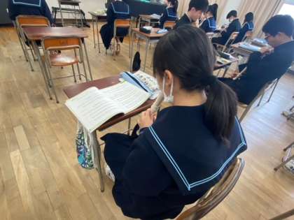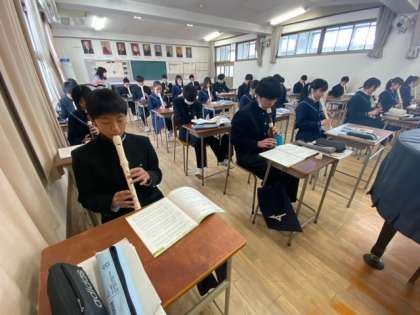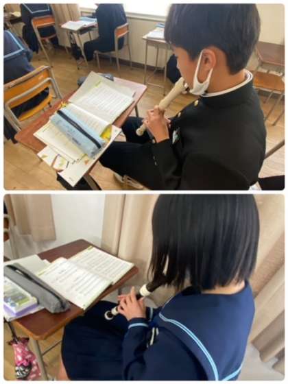 2年生の音楽の授業では、リコーダーのテストを行っています。「ラバースコンチェルト」の曲をアルトリコーダーで演奏します。運指、音色、リズムなど、素敵な演奏ができるように頑張っています。