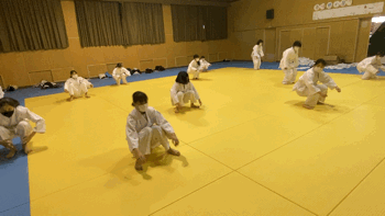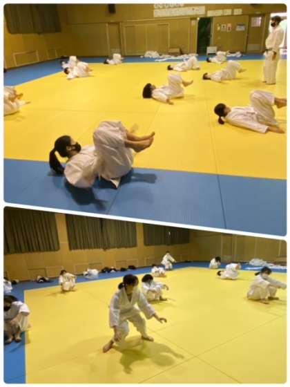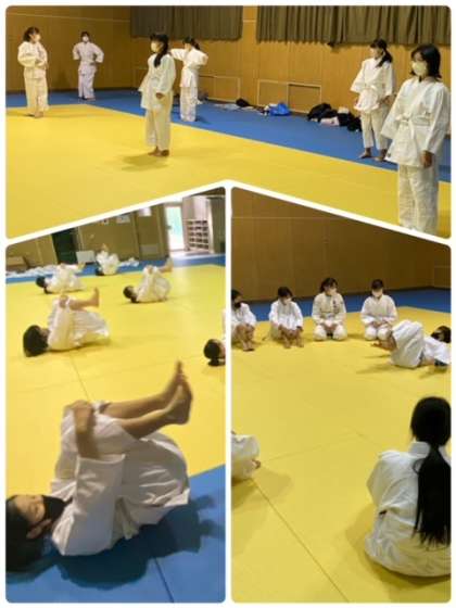 1年生の女子体育は格技室で武道に取り組んでいます。柔道着に着替えるところから学習し、受け身の練習に入りました。基本動作を繰り返し行うことで身に付けるように指導しています。