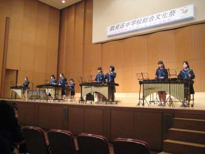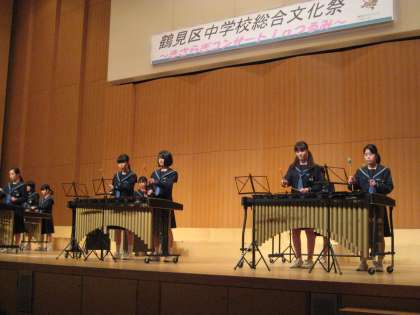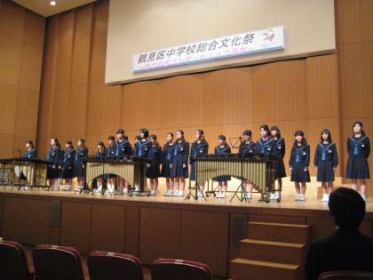 表彰式に続いて、鶴見区5中学校の音楽部・吹奏楽部による演奏が行われ、トップバッターで本校・音楽部がマリンバの演奏を披露しました。