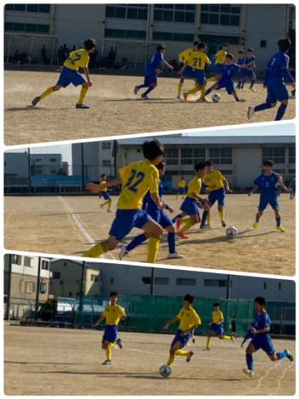 天満中と対戦し、開始早々にコーナーキックからのプレーで先制しました。前半1対0で先攻しています。